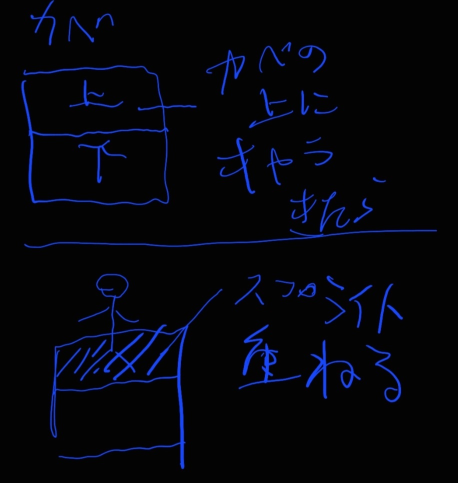 重ね合わせのやり方は色々あるでしょうがとりあえず①壁の上部にキャラが来たら壁の一部をスプライトに変えてキャラの上に重ねる②それ以外の位置にキャラが来たらスプライトを消す(キャラに重ねない)分かりやすくする為スプライトはずらしてますが、こんな感じかな😅