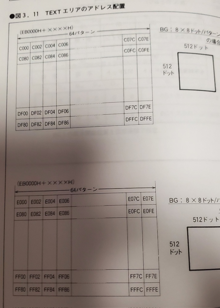 前回まででテキスト、スプライト、グラフィックは出せました次はいよいよBGです8✕8ドット(モードによる)のパターンを作ってそれをタイルの様に埋めて作る画面、主に背景に使われる事が多い様です参考書…何でTEXTって書くの?BGの事って分かるまで時間かかったわ🙉