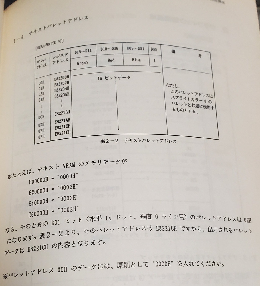 テキストは4面あって4面合わせた情報を元に色指定するようです簡略化したイメージですがあるドットが0面 11面 02面 03面 0ならば0001となり0000 黒0001 赤~1111 白みたいなテーブルを参照し「赤」と決めますクセがスゴない?